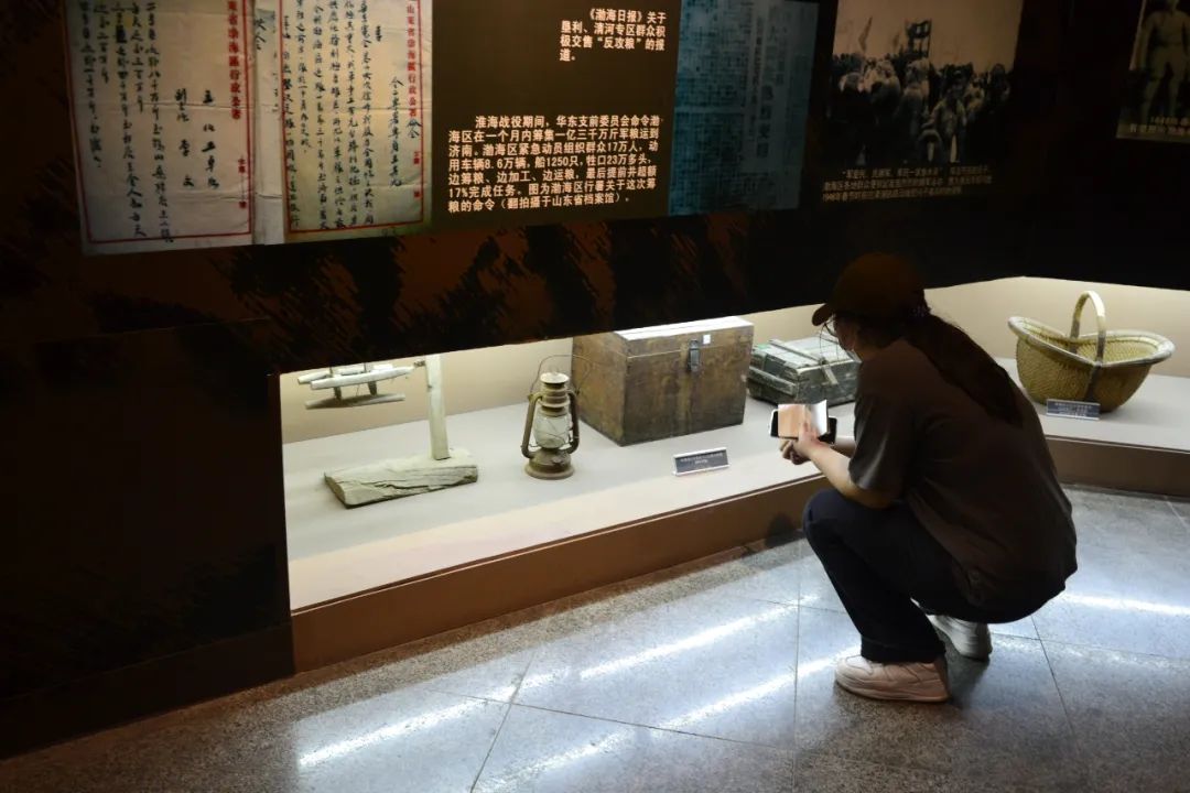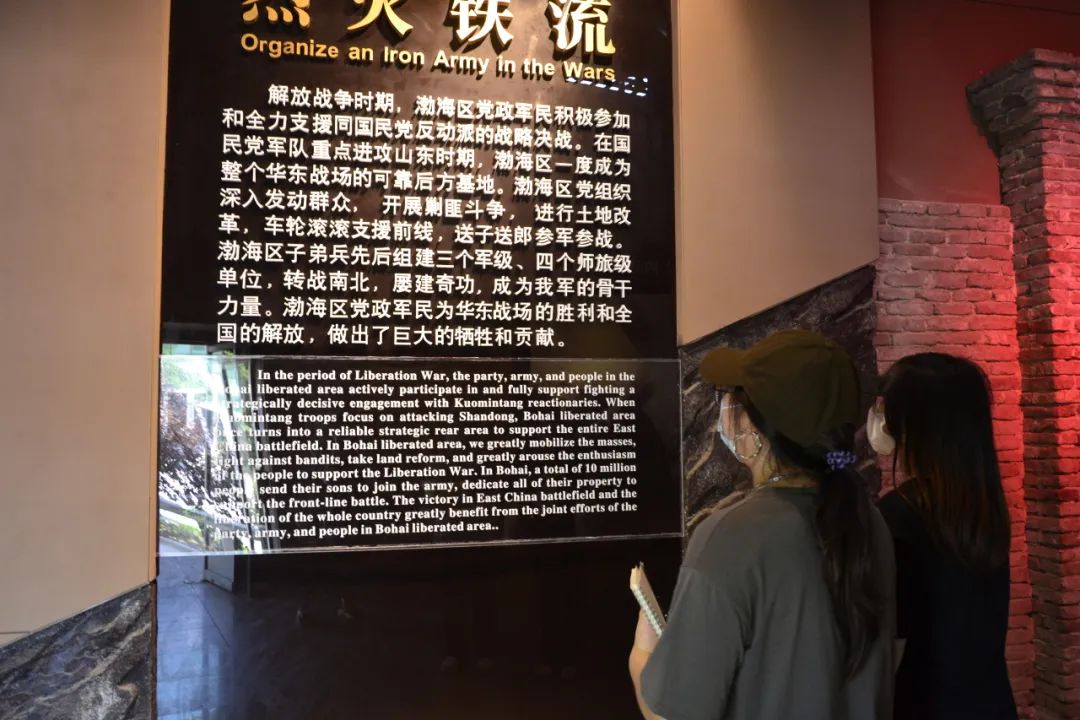 当同学们来到园区时,正对大门的就是渤海革命老区纪念馆,纪念馆是革命老区的核心部件之一,通过窗户所看到的革命英雄的雕像也是很触动人心的,当同学们步入馆内,面对的是渤海革命老区战争年代的大量历史图片,革命文献,文物,辅以历史场景复原,电视短片,艺术雕塑等,深刻表现了当时渤海区战争的艰辛与不易。走进厅堂,迎面是名为渤海魂的群星雕塑,形象再现革命战争年代渤海军民不屈不挠,前赴后继,浴血奋战,艰苦奋斗的辉煌场景。据说在渤海战役期间陈毅等人在此驻留过,这对于渤海革命老区的意义是非常重要的。其中,有许世友,毛岸英等革命先烈的生平事迹以及其在渤海地区作出的贡献。