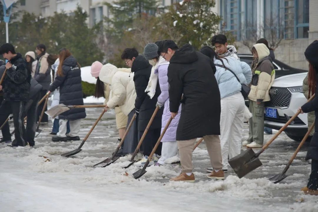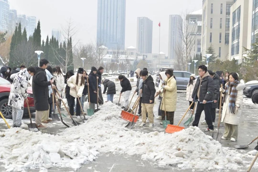 在路面积雪后的第一时间,学院迅速组织部署,落实扫雪除冰工作,确保人员、装备、物资全部到位,组织党支部、团支部投入到扫雪的行列中,青年学生志愿者和学院党员教师也积极出动,迅速开展积雪清扫工作。
