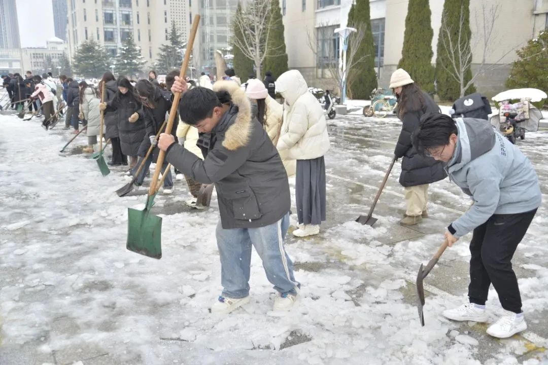 “同学们,校园的积雪暗冰需要清理,咱也要出一份力,都谁能参加扫雪除冰志愿服务?”“我报名”“我也去”……建筑学子在清理积雪、暗冰,保障师生出行行动中主动亮身份、作表率,挺膺担当青年先锋,清扫出一条条“温暖平安路”。全院13个班级参与扫雪铲冰等志愿服务活动,累计参与师生230余人次。