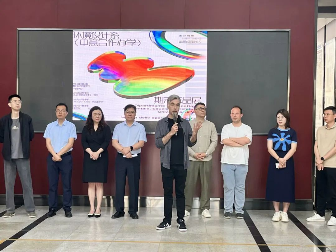 院长隋杰礼在致辞中,高度肯定了参展作品的质量和同学们的辛勤付出,认为本次作业展充分展现了学院在师资力量、学生专业与文化素养、人文环境等方面大幅提升,希望通过合作交流产出更加丰硕的教学成果。随后,中方课程指导教师王金花和意方课程指导教师雅各伯分别讲话。