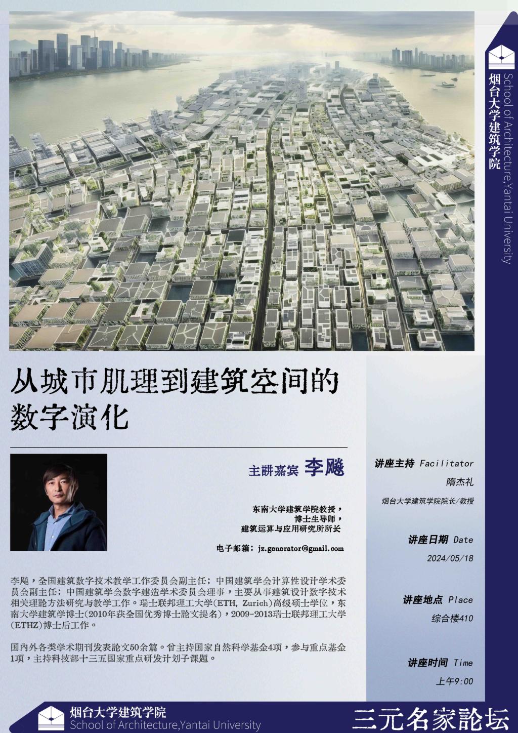李飚,全国建筑数字技术教学工作委员会副主任;中国建筑学会计算性设计学术委员会副主任;中国建筑学会数字建造学术委员会理事,主要从事建筑设计数字技术相关理论方法研究与教学工作。瑞士联邦理工大学(ETH, Zurich)高级硕士学位,东南大学建筑学博士(2010年获全国优秀博士论文提名),2009-2013瑞士联邦理工大学(ETHZ)博士后工作。国内外各类学术期刊发表论文50余篇。曾主持国家自然科学基金4项,参与重点基金1项,主持科技部“十三五”国家重点研发计划子课题。
